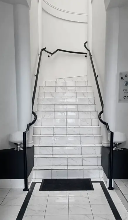 With a goal to refresh the tired interior and add a high-end, luxurious feel to the common space we selected white marble tiling and white interior paint, complemented by new, custom designed and manufactured balustrade, lighting and a feature entrance door.